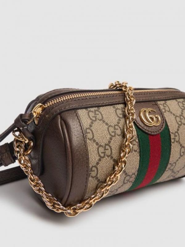 The Ophidia collection evokes the House’s heritage with the signature Web stripe and Double G emblem in light gold-toned finish. The styles are crafted from soft GG Monogram coated fabric, featuring green cotton lining inside.