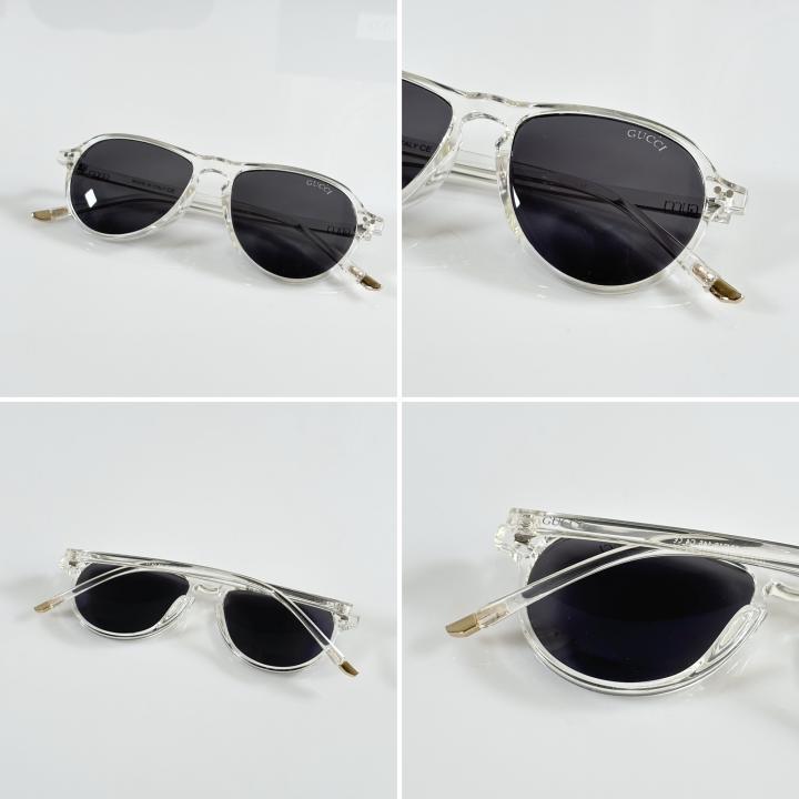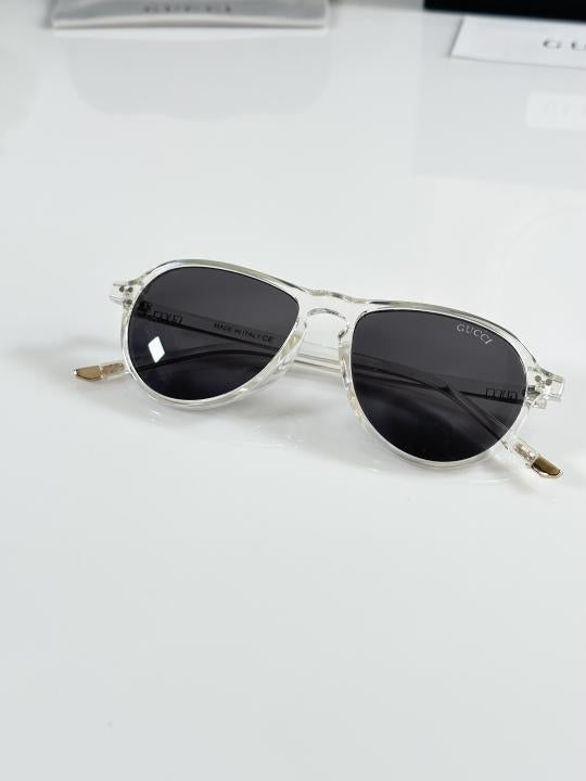 The Pre-Fall 2025 eyewear collection blends statement silhouettes from the archives with a contemporary touch. These oval frame sunglasses are stated in light ruthenium metal with a cut-out Gucci logo detail.