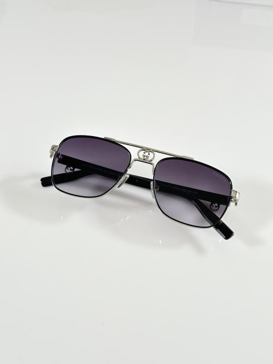 The Pre-Fall 2025 eyewear collection blends statement silhouettes from the archives with a contemporary touch. These oval frame sunglasses are stated in light ruthenium metal with a cut-out Gucci logo detail.