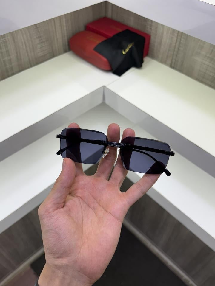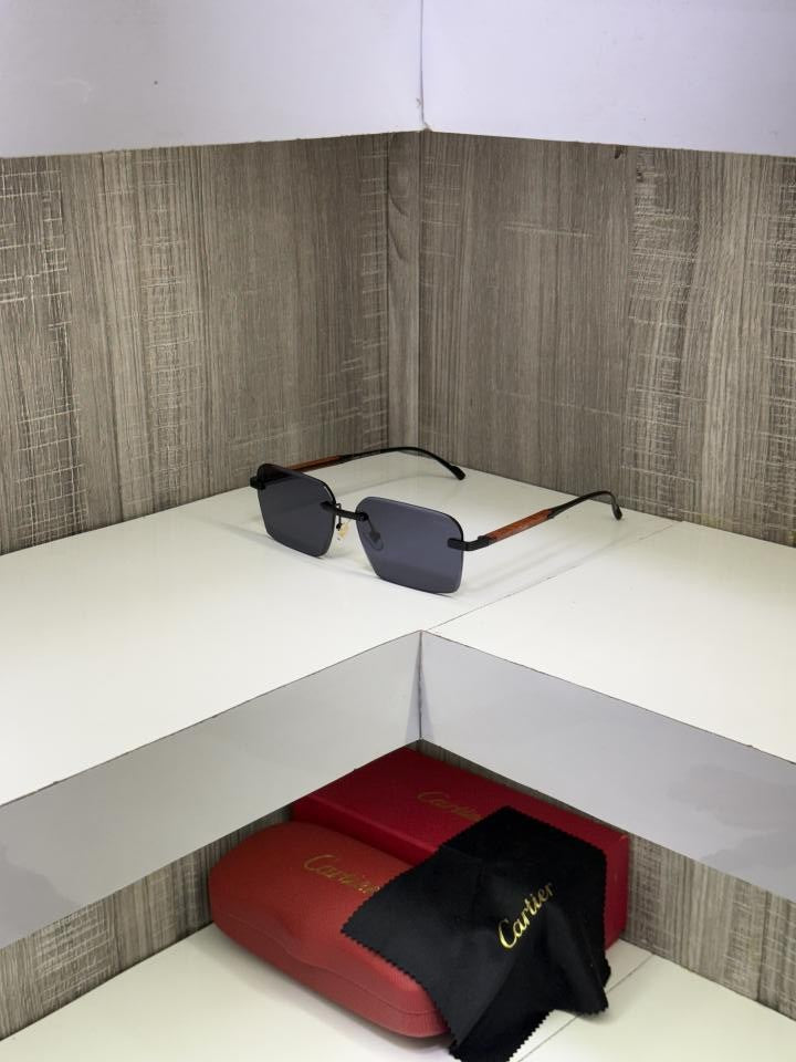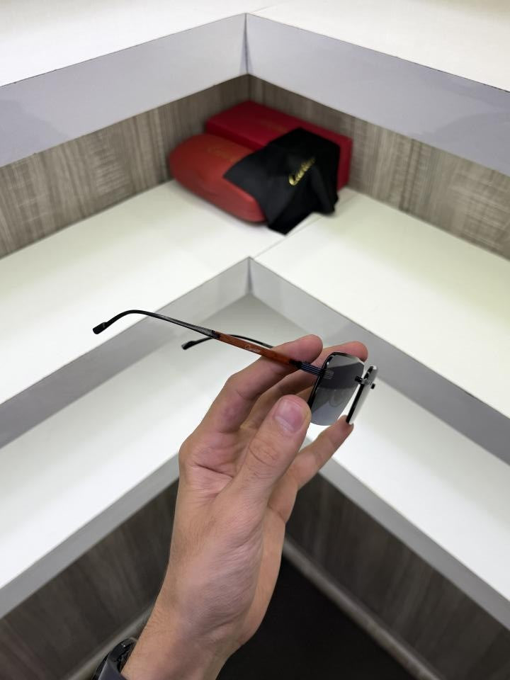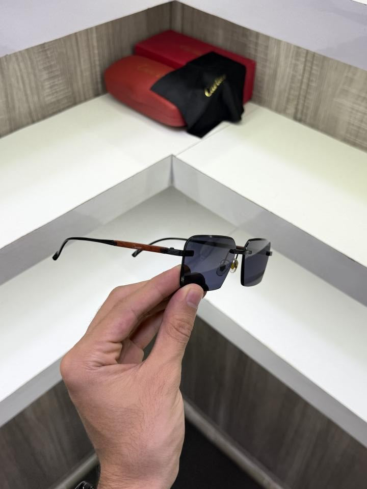 C de Cartier sunglasses in combined two-tone black PVD and champagne golden-finish, rectangular shape with metal double bridge, gadroon bridge and motif with smooth champagne golden-finish, dark gray lenses, black acetate temples with Cartier signature. Dimensions: 54 mm lenses, 21 mm bridge, 145 mm temples.