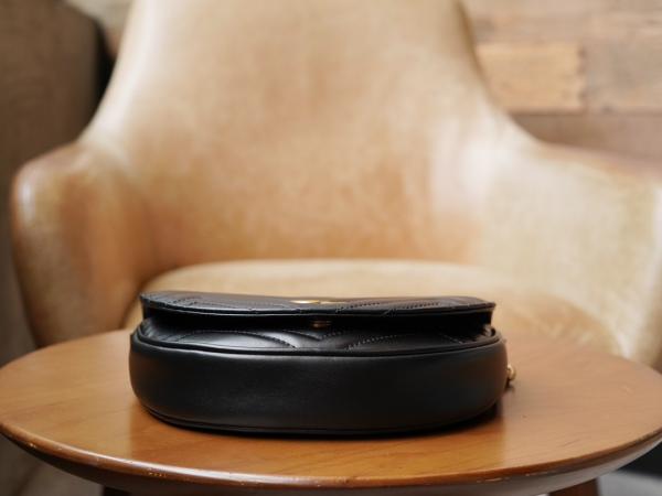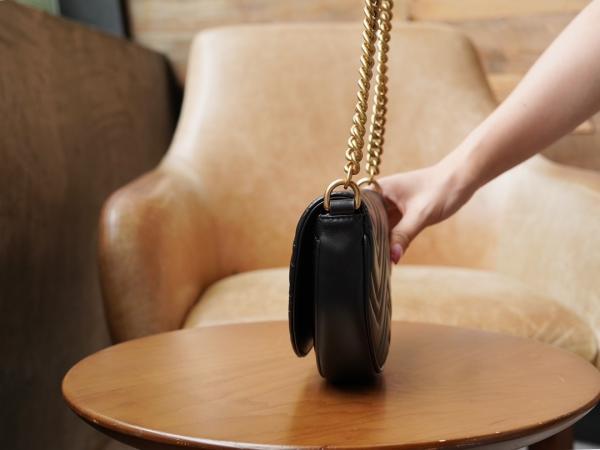 The GG Marmont, a signature collection of the House, features the Double G hardware, a faceted chain strap, and soft construction in an exceptionally supple leather. This mini bag is complete with the archival logo, first introduced in the 1970s.