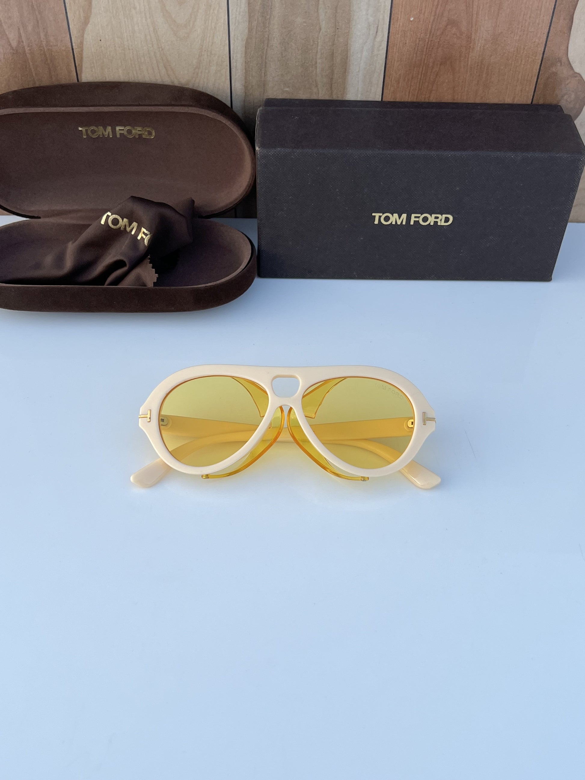 SHINY ACETATE STYLE WITH SHINY METAL T LOGO ON THE TEMPLE.