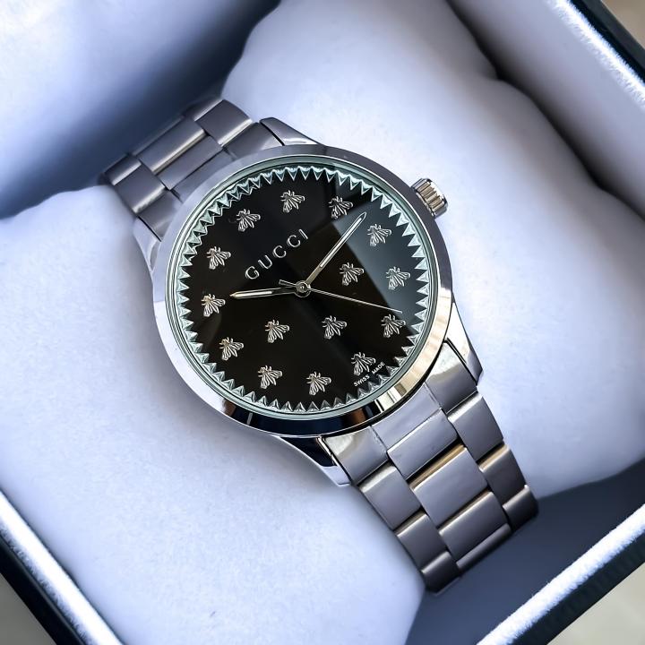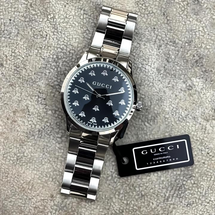 The G-Timeless line continues to define the latest collections, highlighting the signature motifs of the House. Presented with a quartz movement, the accessory features a stainless steel bracelet enriched with a silver-toned dial. The emblematic Interlocking G adds a soft logo touch to the piece.