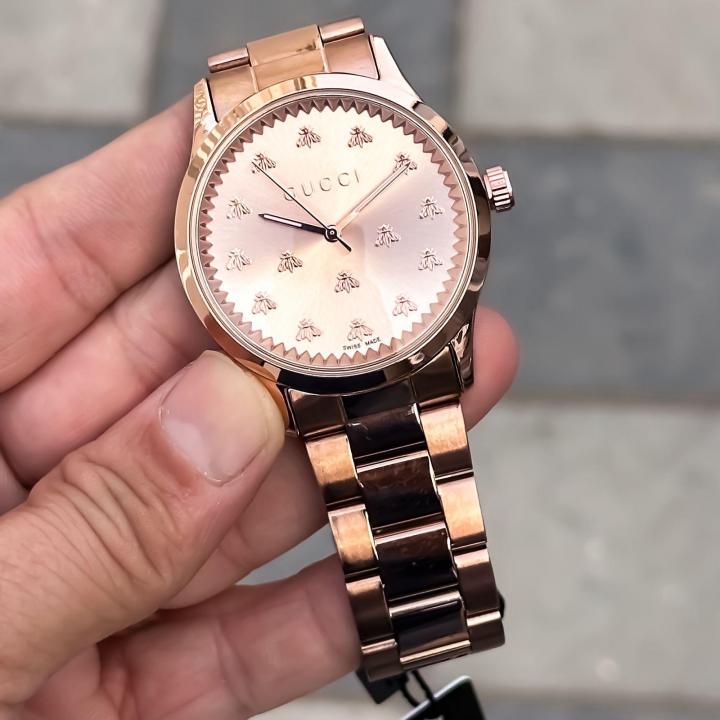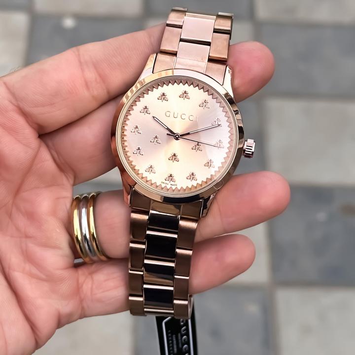 The G-Timeless line continues to define the latest collections, highlighting the signature motifs of the House. Presented with a quartz movement, the accessory features a stainless steel bracelet enriched with a silver-toned dial. The emblematic Interlocking G adds a soft logo touch to the piece.